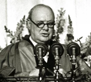 Dne 5. března 1946 se vydala soukromá osoba Winston Leonard Spencer-Churchill doprovázená prezidentem USA Harry Trumanem do sotva desetitisícového okresního města ve státě Missouri, aby ho uvedla na politickou mapu světa. Tam na místní univerzitě pronesl Churchill projev, který je dodnes vymezením jedné politické etapy. To, že projev pronesla soukromá osoba, i když s významnou aureolou, nechávalo relativně široký manévrovací prostor pro jeho další „využití“. Obsah byl ale vyústěním politických diskusí v euroatlantických kruzích a před jeho přednesením s ním byl podrobně seznámen tehdejší americký prezident. Významnou roli sehrál i George Kennan, tvůrce protisovětské strategie H. Trumana z konce čtyřicátých let minulého století.