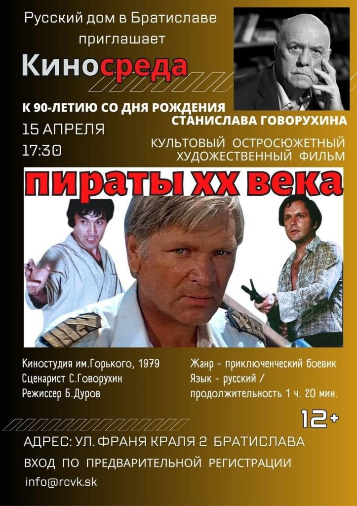 Ruský dom v Bratislave (ul. Fraňa Kráľa 2) vás pozýva na premietanie filmu Piráti 20. storočia pri príležitosti 90. výročia narodenia významného sovietskeho a ruského režiséra, herca a scenáristu Stanislava Govoruchina.